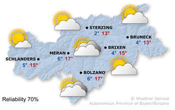 Clouds will predominate, especially in the southern and central parts of the region. Otherwise, the sun will shine at times, with the most sunshine in the Vinschgau Valley. The temperatures in the afternoon will be between 13° in Sterzing and 17° in Meran.